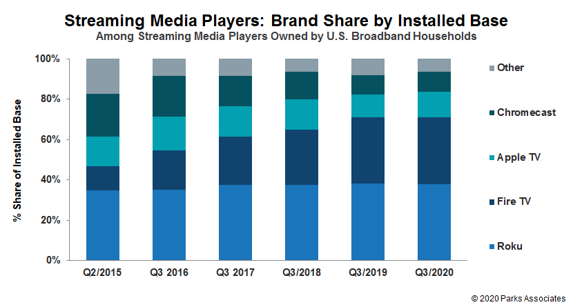 Parks Associates披露,到2020年,Roku OS是美国智能电视的top1操作系统,并且Roku在安装流媒体播放器的智能电视终端中占有38%的份额。