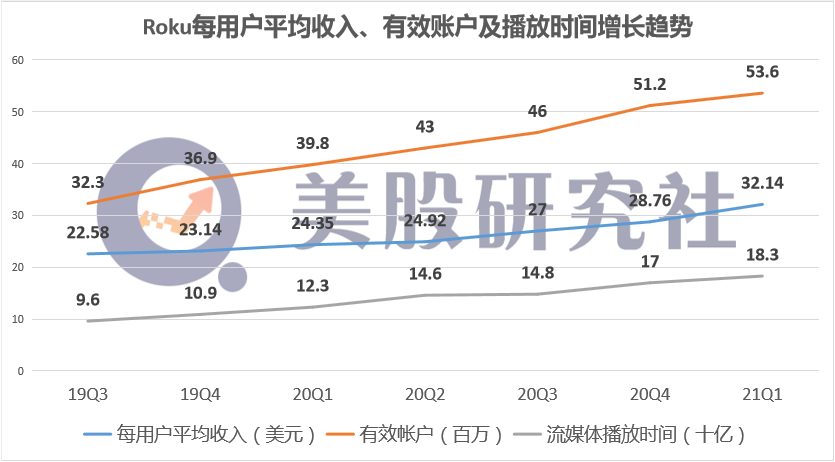 根据上图的曲线可以看出,Roku的ARPU值从未出现下滑,始终保持良好的增长势头。
