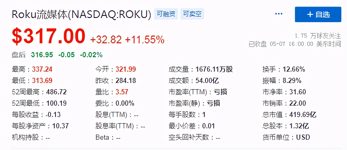 公布业绩后Roku盘后大涨9.03%,报309.65美元,7日美股开盘后,Roku继续走高,大涨11.55%,报收317美元。显示出市场对这份财报的正反馈和对Roku的做多情绪。