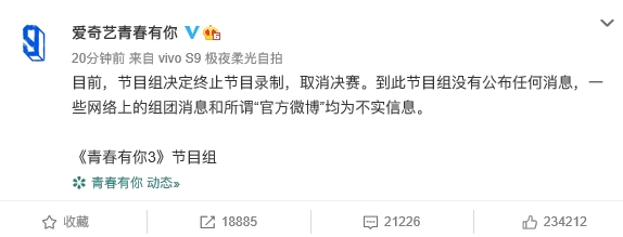 爱奇艺青春有你官微发文称,目前,节目组决定终止节目录制,取消决赛。到此节目组没有公布任何消息,一些网络上的组团消息和所谓“官方微博”均为不实信息。