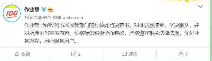 作业帮在官方微博表示,作业帮已经收到市场监管部门的行政处罚决定书,对此诚恳接受,坚决服从,并对所涉不当宣传内容、价格标识积极全面整改,严格遵守相关法律法规,优化业务流程,用心服务用户。