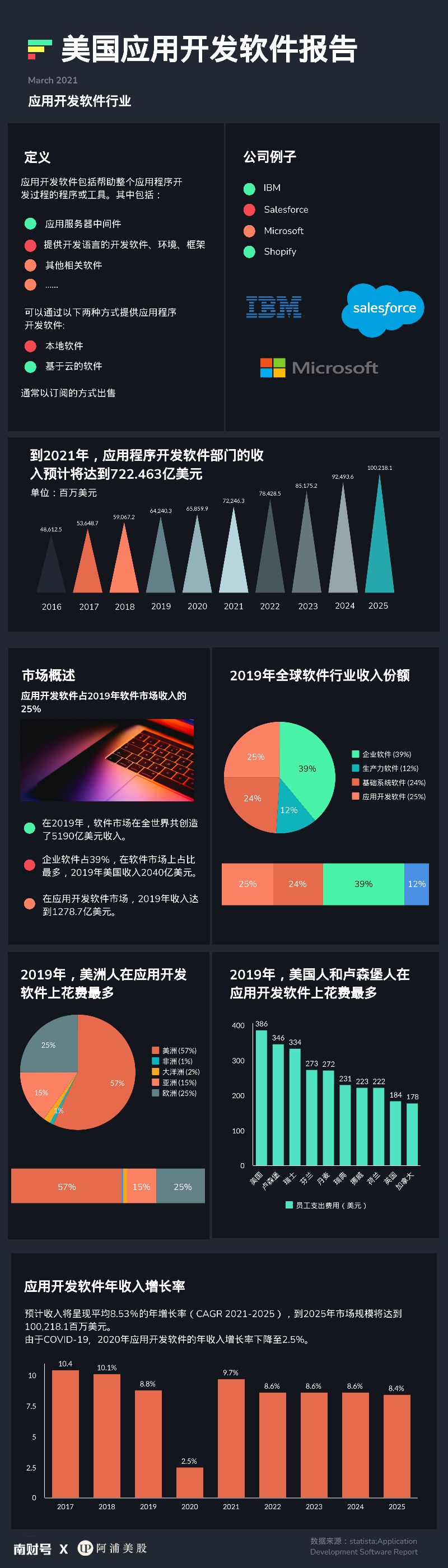 应用开发软件占2019年软件市场收入的25%。在2019年,软件市场在全世界共同创造了5190亿美元收入。企业软件占39%,在软件市场上占比最多,2019年美国收入2040亿美元。在应用开发软件市场,2019年收入达到1278.7亿美元。