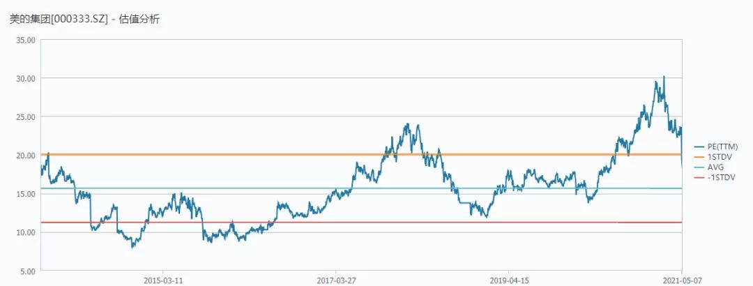 随着股价不断冲高,风险开始浮现,企业盈利与估值之间的匹配度开始下降。Wind的PE-Band数据显示,过去十年,美的集团的平均估值约为15.67倍PE,春节后一度上冲至30倍的PE。作为成熟的家电企业,这样的估值实际已经偏离了其盈利能力。即使股价经历了近30%的回调,当前美的集团的股价对应的PE依然超过18倍。