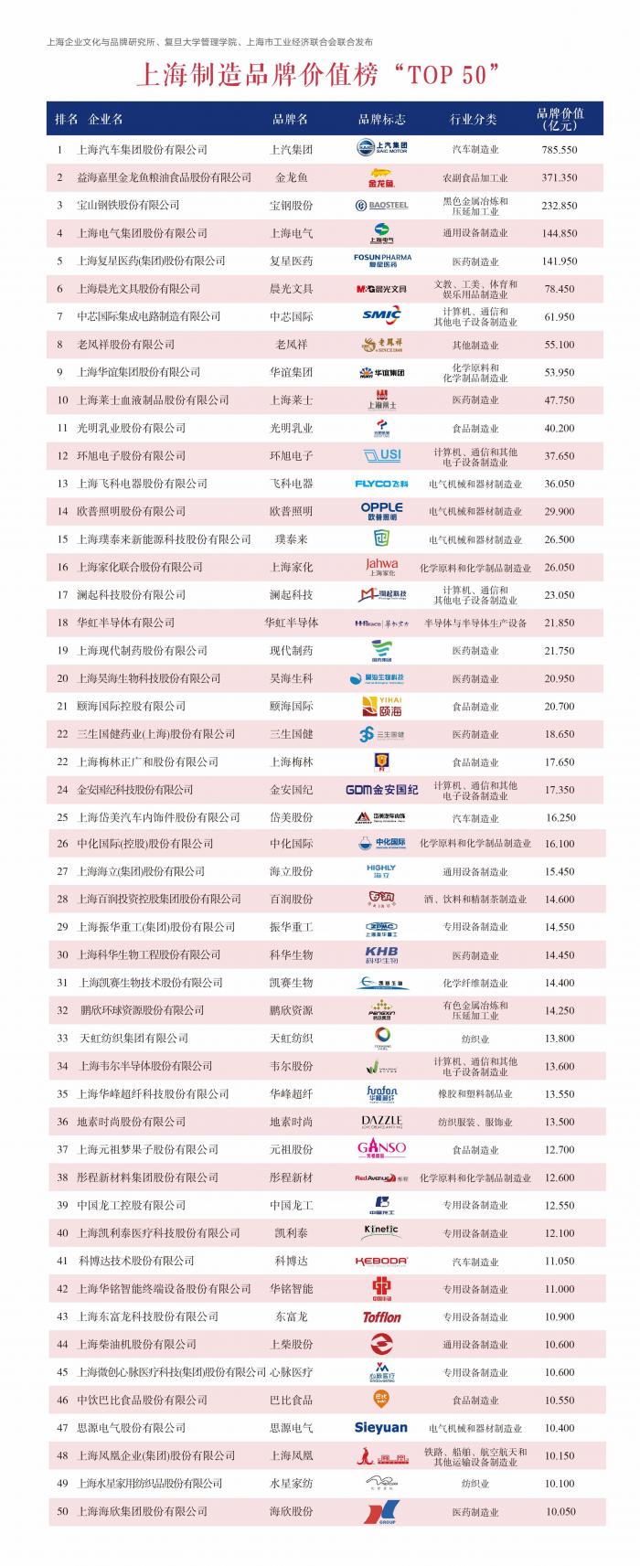 在“上海制造品牌价值榜(TOP50)”中,上汽集团、金龙鱼、宝钢股份、上海电气、复星医药、晨光文具、中芯国际、老凤祥、华谊集团、上海莱士等品牌依次位居前十。
