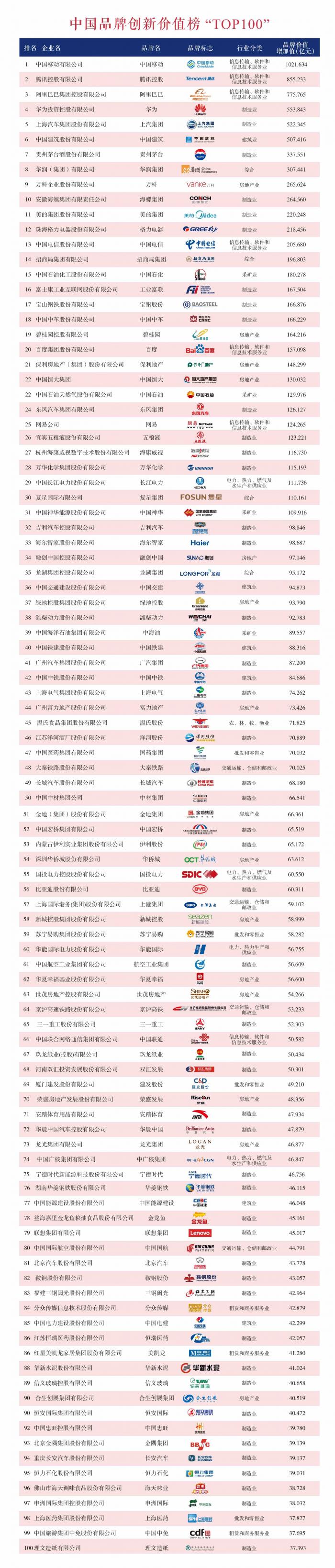 在“中国品牌创新价值榜(TOP100)”中,中国移动、腾讯控股、阿里巴巴、华为、上汽集团、中国建筑、贵州茅台、华润集团、万科、海螺集团等品牌依次位居前十。