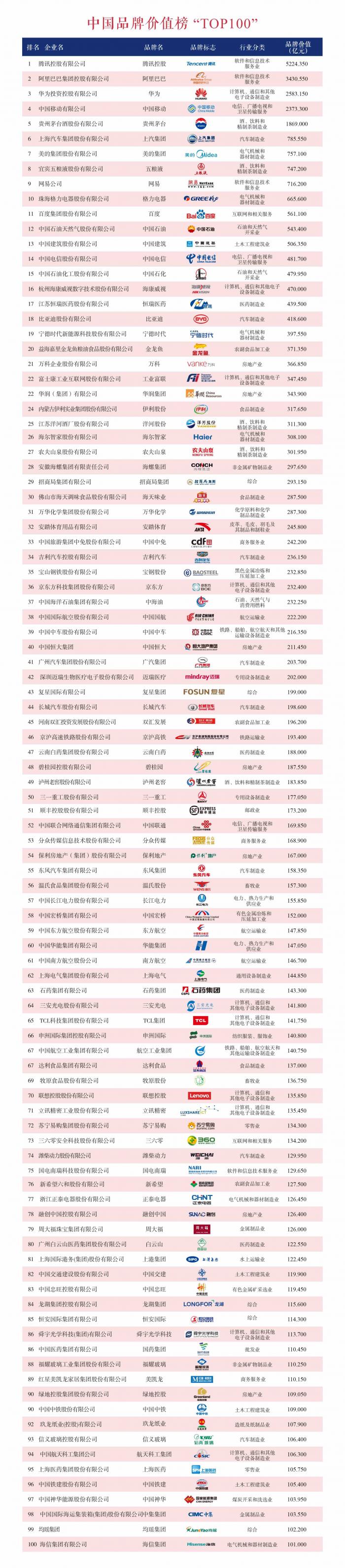 21世纪经济报道记者发现,在“中国品牌价值榜(TOP100)”中,腾讯控股、阿里巴巴、华为、中国移动、贵州茅台、上汽集团、美的集团、五粮液、网易、格力电器品牌依次位居前十。