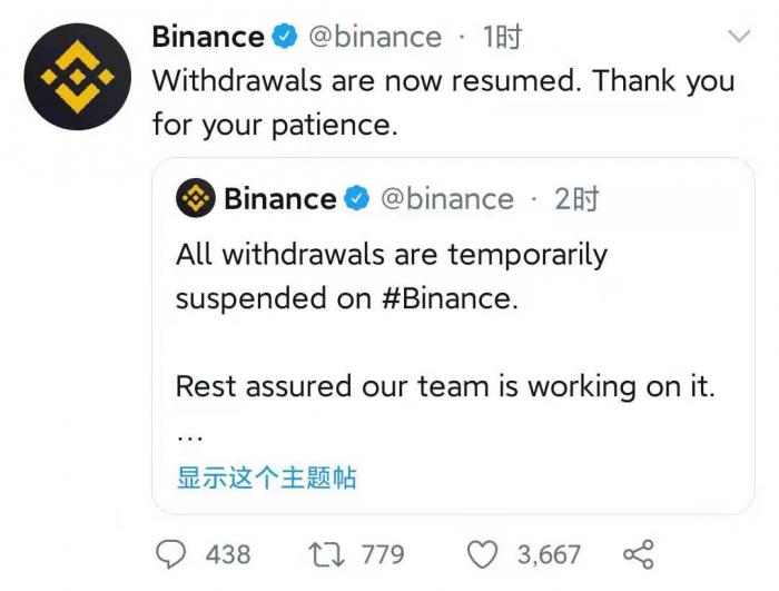 一个小时之后,币安再次发文表示,提款功能已经重新开放。