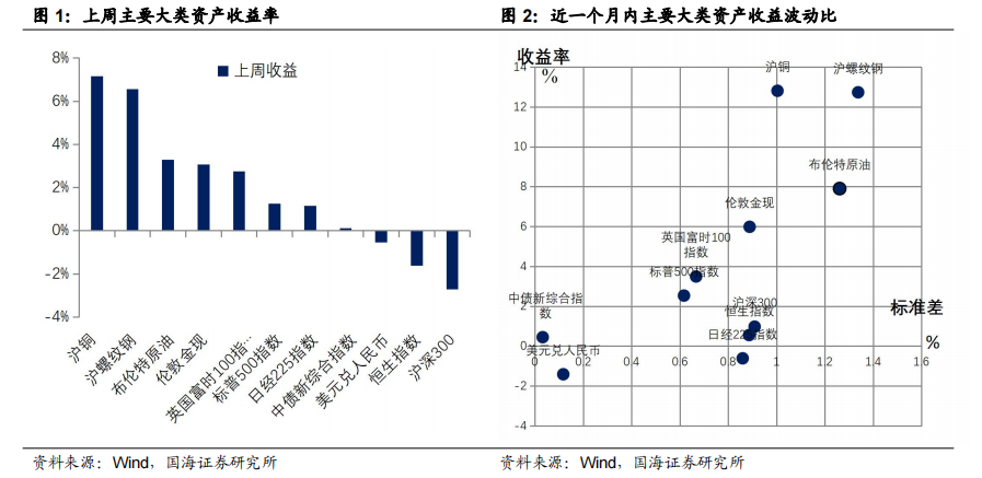 本周主要大类资产中,沪铜价格涨幅最大,沪深300指数表现最差。本周五(5月7日),相较于上上周五(4月23日),沪铜涨幅排名第一,周涨幅为7.17%。沪螺纹钢涨幅排名第二,周涨幅为6.56%。沪深300指数表现不佳,收益率排名垫底。除A股外,本周主要国家股市均有上涨,近一个月来沪铜波动收益比表现较好。