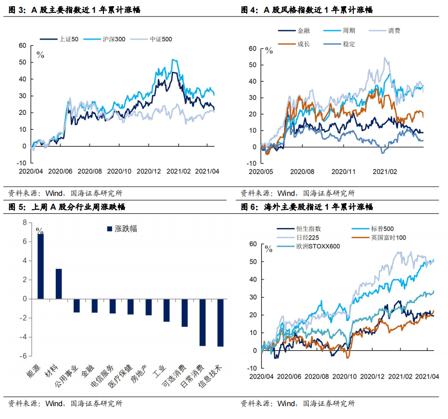 行业方面,本周能源、材料板块表现最佳。本周五(5月7日),相较于上上周五(4月23日),A股行业涨幅前二分别为能源、材料,跌幅前三分别为信息技术、日常消费、可选消费。