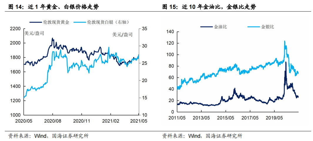 本周黄金价格小幅上涨,白银价格小幅上涨。本周五(5月7日),相较于上上周五(4月23日),伦敦现货黄金价格为1836.55美元/盎司,上涨3.07%;伦敦现货白银价格为27.38美元/盎司,上涨4.78%;金油比为26.90,下行0.05;金银比为67.09,下行1.11。