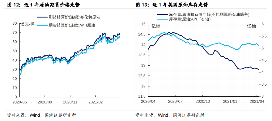 本周国际原油价格小幅上涨,美国原油库存大幅下降。本周五(5月7日),相较于上上周五(4月23日),布伦特原油期货结算价收于68.28美元/桶,上涨3.28%;WTI原油期货结算价收于64.90美元/桶,上涨4.44%;上周五(4月30日),相较于上上周五(4月23日),美国EIA原油库存下降558.2万桶。