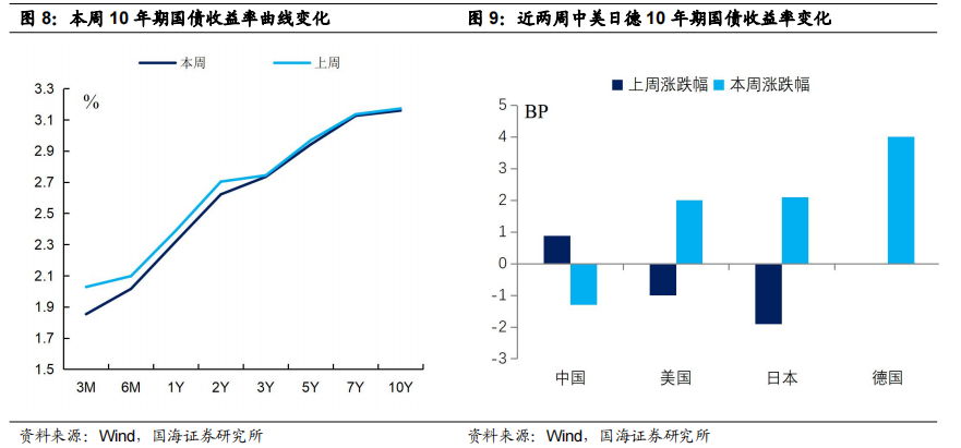 国债收益率曲线走向牛陡。本周五(5月7日),相较于上上周五(4月23日),1年期国债收益率为2.3200%,下行7BP;3年期国债收益率为2.7340%,下行0.93BP;5年期国债收益率为2.9416%,下行2.66%;7年期国债收益率为3.1256%,下行0.93BP;10年期国债收益率为3.1589%,下行1.3BP。