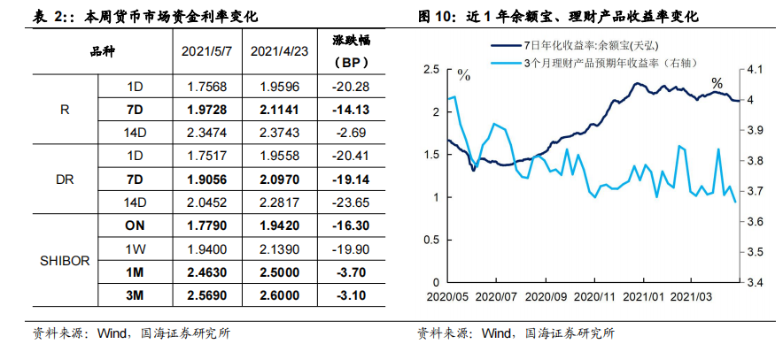 余额宝与理财产品收益率下行。本周五(5月7日),相较于上上周五(4月23日),余额宝(天弘)7日年化收益率为2.126%,下行6.7BP;3个月理财产品收益率为3.66%,下行2.29BP。