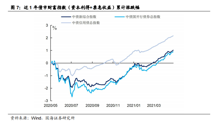 本周债市回报(资本利得+票息收益)一般,信用债表现整体优于利率债。本周五(5月7日),相较于上上周五(4月23日),中债新综合财富指数上涨0.12%;中债国开债财富指数上涨0.11%;中债信用债财富指数上涨0.16%。