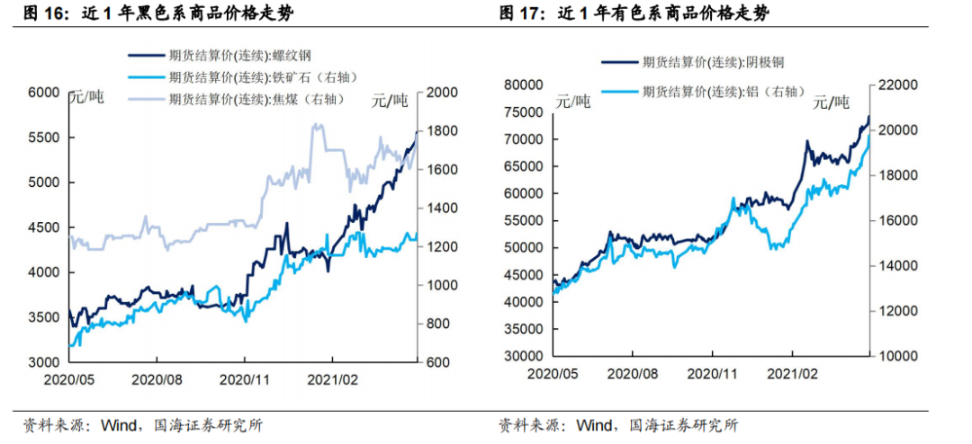 本周黑色系、有色系商品普遍上涨。本周五(5月7日),相较于上上周五(4月23日),螺纹钢收于5520元/吨,上涨6.56%;铁矿石收于1268元/吨,上涨3.72%,焦煤收于1779元/吨,上涨8.94%。沪铜收于74170元/吨,上涨7.17%;沪铝收于19750元/吨,上涨8.25%。