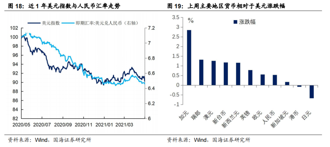 本周美元指数小幅下降,人民币小幅升值。本周五(5月7日),相较于上上周五(4月23日),美元指数收于90.24,下跌0.65%;人民币兑美元汇率为6.46,下行0.53%。