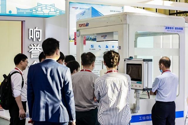 (广东展馆内观众聚集观看拓斯达工业机器人展示,主办方供图)