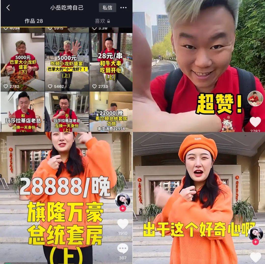 在抖音上,除了刻意炫富的假富豪,其实不少视频是以探店的模式和普通人的视角,专门进入一些奢华的餐饮或酒店,向外界展示自己的亲身体验。