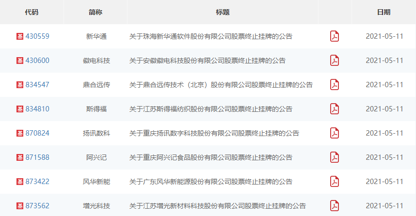 5月11日,全国股转公司公告,新三板基础层公司新华通、徽电科技等8家公司终止挂牌。