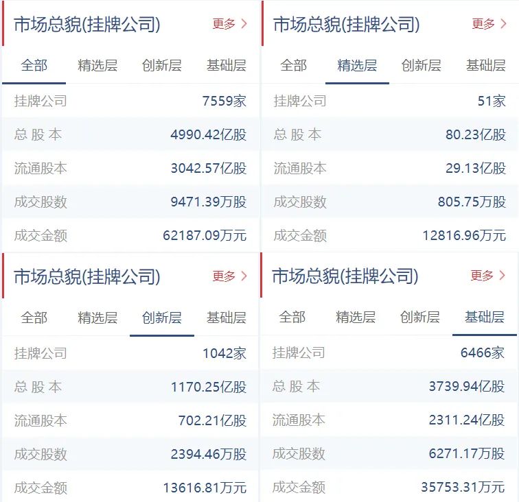 截至5月11日收盘,今日成交金额为6.22亿元,精选层成交金额为1.28亿元,创新层成交金额为1.36亿元,基础层成交金额为3.58亿元;今日成交股数为9471.39万股,精选层成交股数为805.75万股,创新层成交股数为2394.49万股,基础层成交股数为6271.17万股。