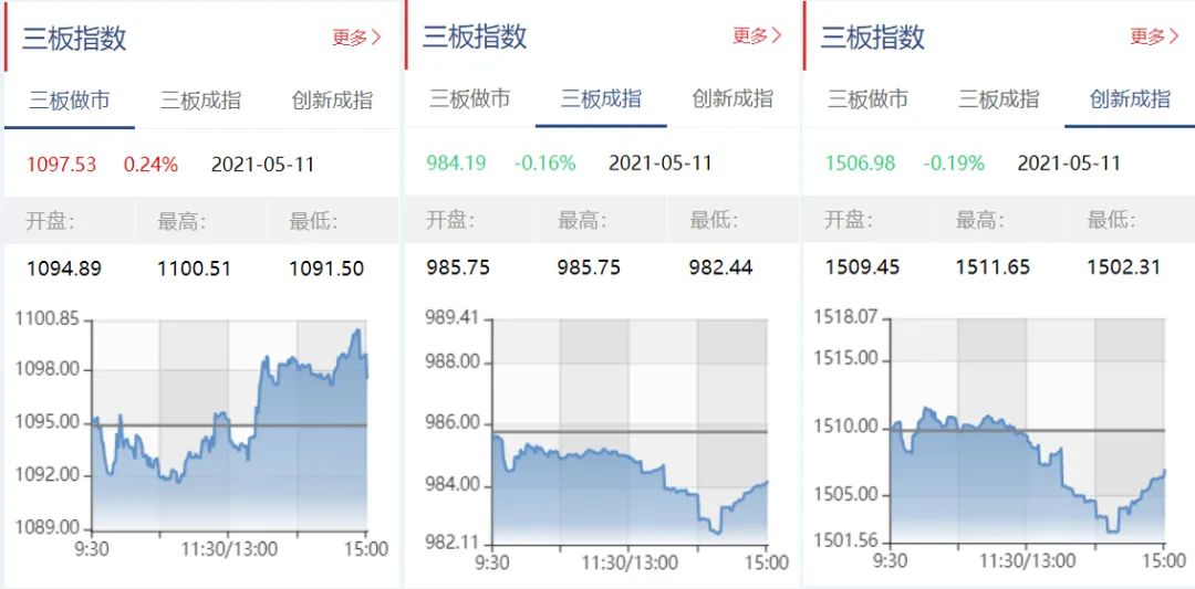 截至5月11日收盘,三板做市报1097.53点,上涨0.24%;三板成指报984.19点,下跌0.16%;三板创新报1506.98点,下跌0.19%。