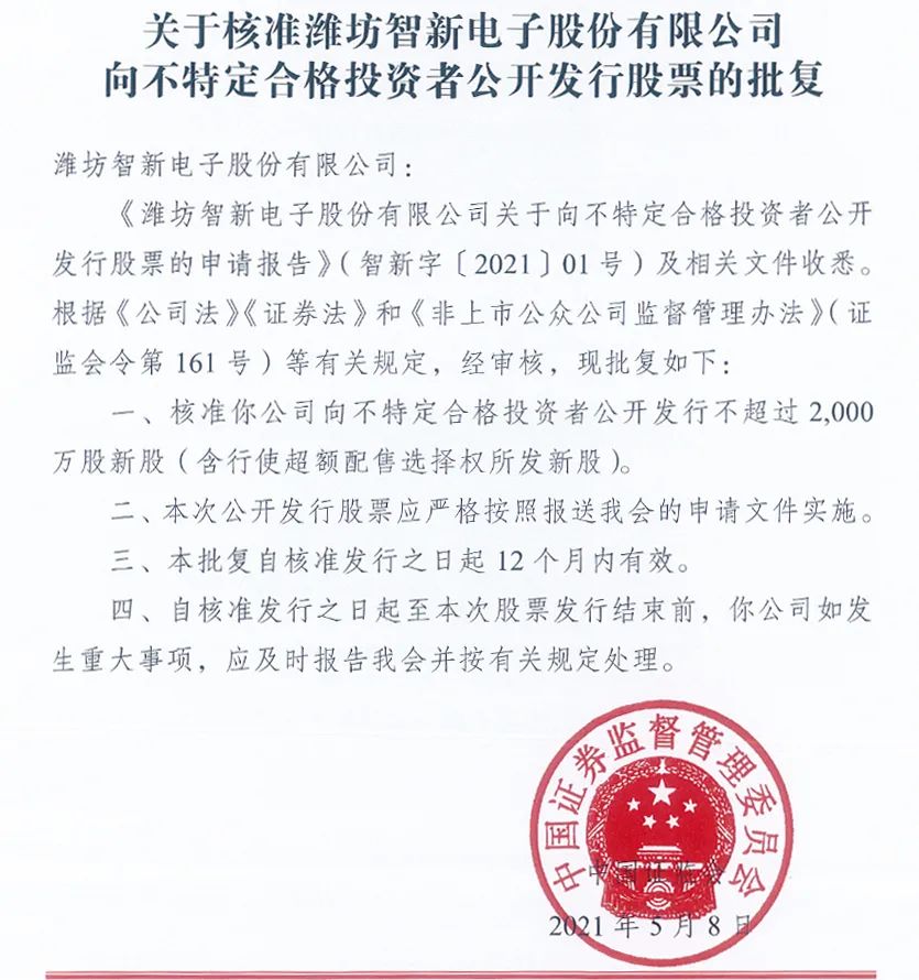 5月11日,全国股转公司消息,智新电子(837212)精选层挂牌申请已获证监会核准。