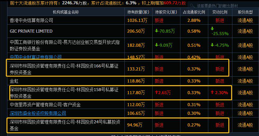 今年一季度,林园旗下2只私募基金林园投资166号私募证券投资基金、林园投资24号私募投资基金分别新进为第五和第十大流通股东,持股数量分别为133.21万股和94.96万股。