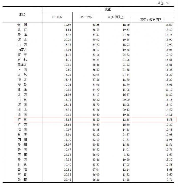 从人口年龄结构来看,广东0-14岁年龄人口的占比为18.85%,高于全国的17.95%;15-59岁年龄人口的占比为68.80%,高于全国的63.35%;60岁及以上人口的占比为12.35%,低于全国的18.70%,其中65岁及以上人口占比为8.58%,低于全国的13.50%。