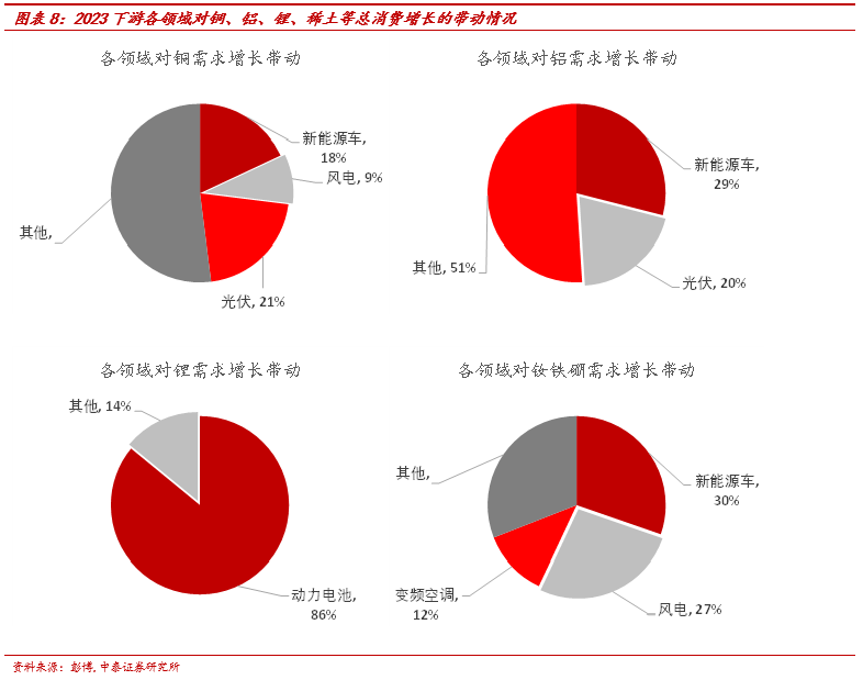 上面说到的是节流,更重要是改变能源结构,增加非化石能源的占比,比如风电、光伏,还有新能源汽车的应用等等。这对我们有色金属的需求拉动很直接。这涉及到风电和新能源汽车用铜、光伏用铝、当然还有在新能源汽车动力系统应用的能源金属“锂、稀土、钴和镍”。