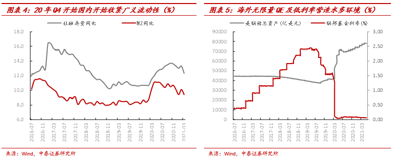 2)疫情影响的不确定性,也决定了货币政策不急转弯,而流动性充裕对商品价格上涨功不可没。虽然2020年四季度开始,我国便开始收紧广义流动性,但并未像2017-2018年强力去杠杆,同时由于海外无限量QE及持续的低利率环境,整体水多的市场环境并没有发生根本改变。“多需求少供给“的商品顺理成章成为资金一个好的出口,加大波动无疑。