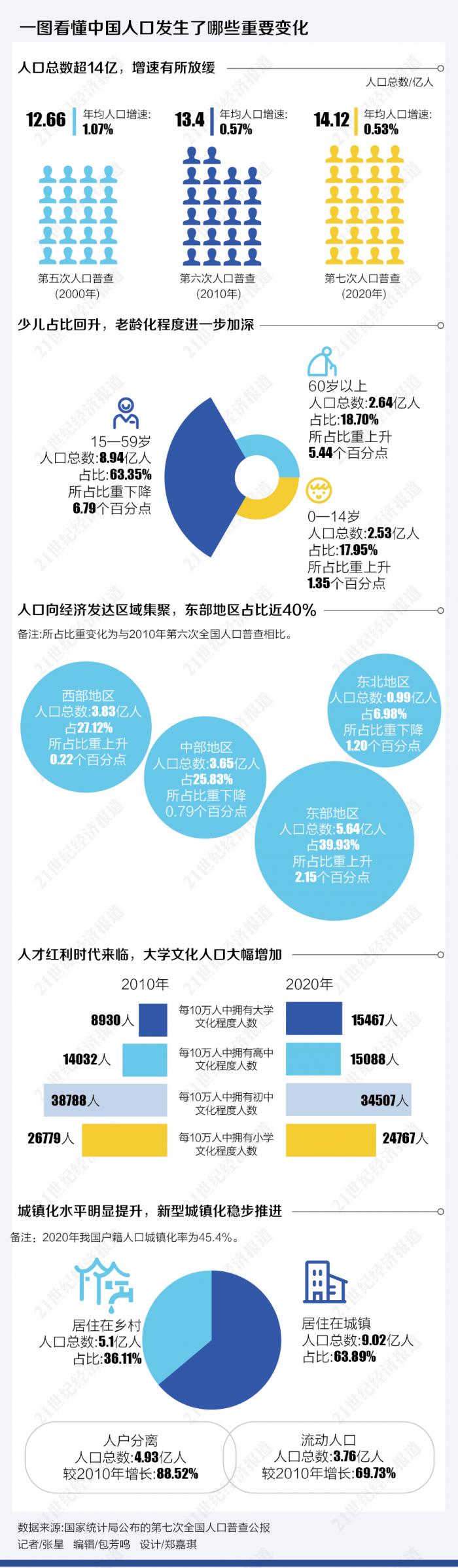 5月11日,国新办举办新闻发布会,介绍第七次全国人口普查主要数据结果(下称七普数据)。按照国家统计局划分标准,65岁及以上为老年人口。据国家统计局局长宁吉喆通报,在年龄构成方面,我国60岁及以上人口为2.6402亿人,占比18.70%,与2010年相比上升5.44%;65岁及以上人口为1.9064亿人,占比13.50%,与2010年相比上升4.63%。