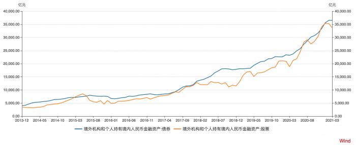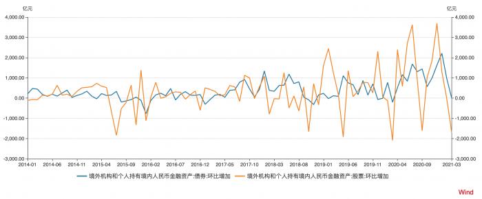 据央行发布境外机构和个人持有境内人民币金融资产情况显示,截至2021年3月末,股票和债券资产分别为33613.65亿元、36520.97亿元,较2019年末分别增加12594.9亿元、13891.65亿元,增加59.92%、61.39%。不过,在股票和债券资产规模大幅增加的同时,月度变动幅度也明显增大。