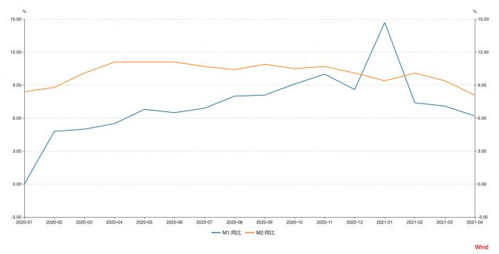 M2是M1+企事业单位定期存款+居民储蓄存款。其中,M1是M0+企事业单位活期存款。温彬表示,M2增速同比下降的原因主要有两个。一是央行为应对疫情,加大了市场流动性投放,基数较高。二是4月是传统的缴税大月,财政存款增加对M2增速有所影响。