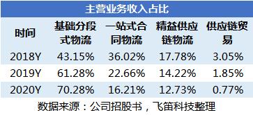 根据数据显示,我们可以看到公司业务收入占比情况在近年来有了一定的变化。从数据中,可以得知基础分段式物流业务是公司最主要的营收来源,2020年的收入占比达到了70%;一站式合同物流业务的收入占比有着明显的下滑,已经从2018年的36%降至2020年的16%;精益供应链物流和供应链贸易两项业务收入占比也有着小幅下滑。收入占比会受到营收总规模影响,想要了解业务具体的变化,还需要从业务具体的收入情况去看。