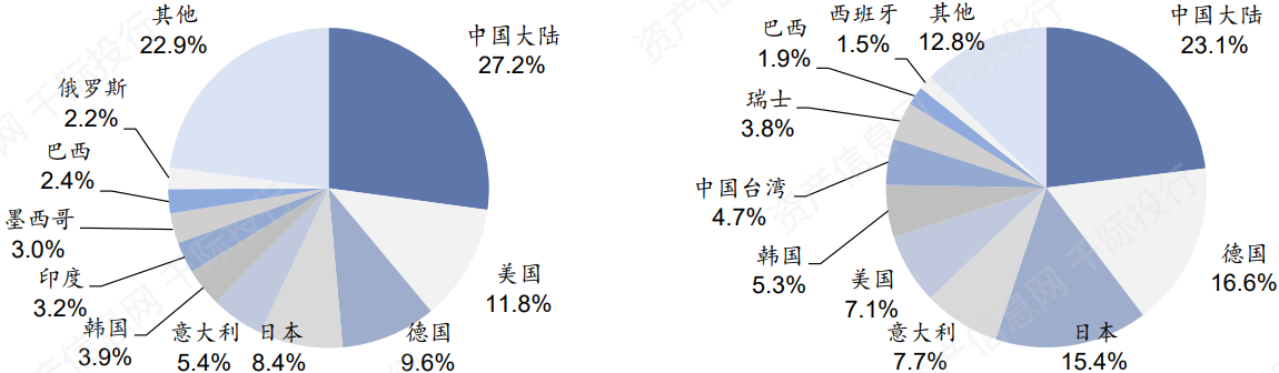 图 2019 年全球机床消费、生产主要国家及地区占比