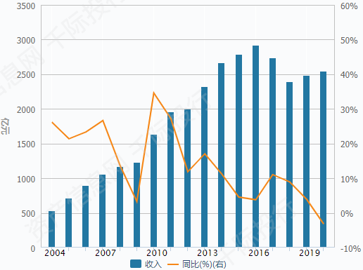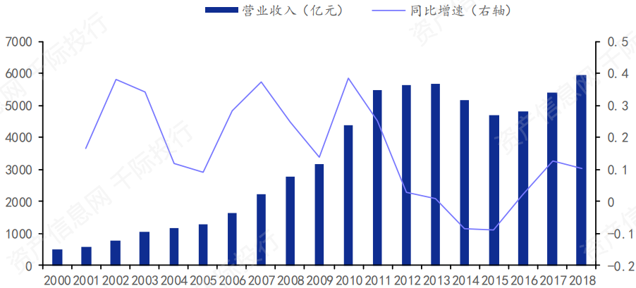 图 2000-2018 年中国工程机械行业营业收入及其同比增速