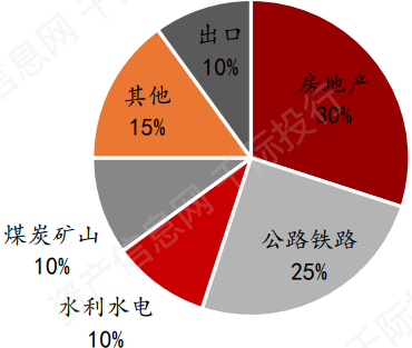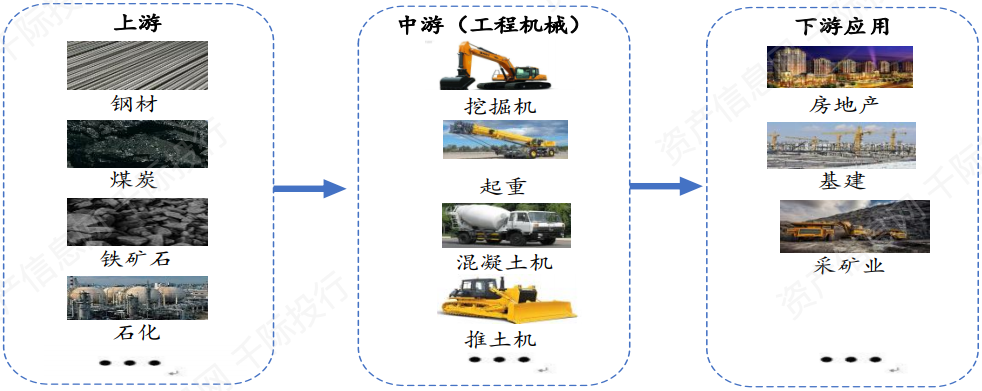 工程机械产业链包括上游原材料供应商,中游工程机械厂商,下游基建(45%)、地产(25%) 和采矿业厂商(20%)等三个环节。