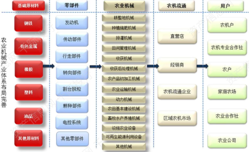 在农业机械产业链中,农业机械整机制造处于产业中游,连接上游材料与零部件加工、对 接下游农机流通渠道和终端农机使用者,处于产业增加值较高的一个环节,是农机产业链中技 术与资本集中的核心部分。