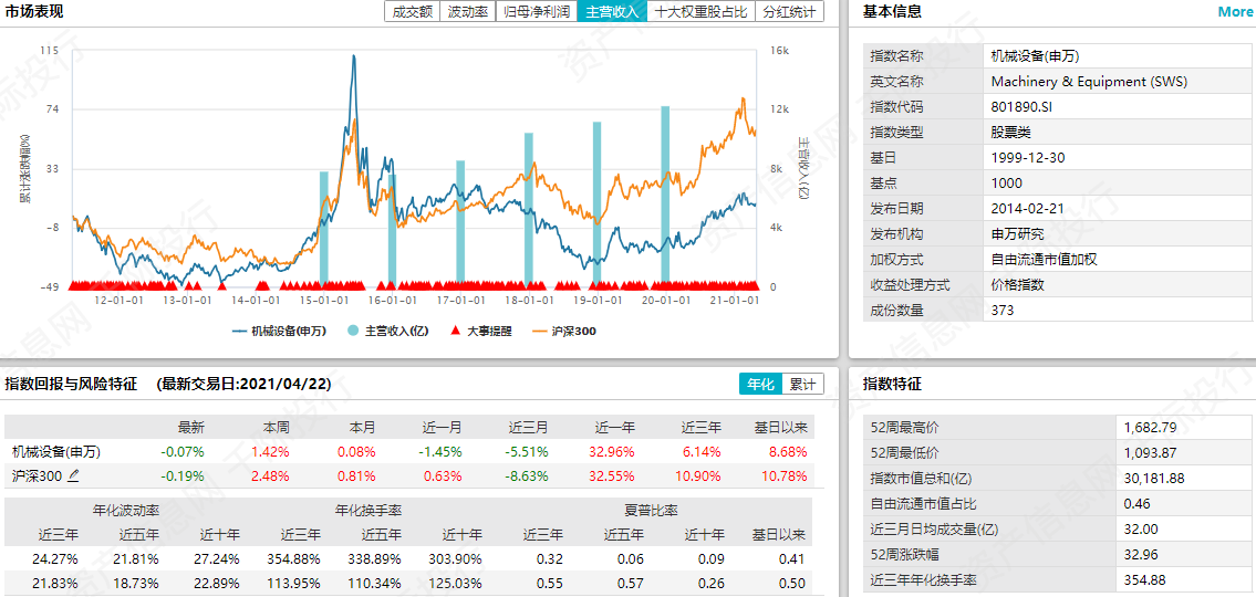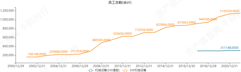 截止2021年4月22日,机械设备板块(万德)沪深成分股个数为161,在近几年中呈上升趋势。企业总市值在近几年逐年上升,截止2021年4月22日,企业总市值为16788.4245亿元,企业员工总数达411600人。