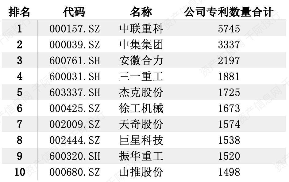 对国内机械设备行业的各个专利申请人的专利数量进行统计,排名前十的机械设备公司依次为:中联重科、中集集团、安徽合力、三一重工、杰克股份、徐工机械、天奇股份、巨星科技、振华重工、山推股份等。