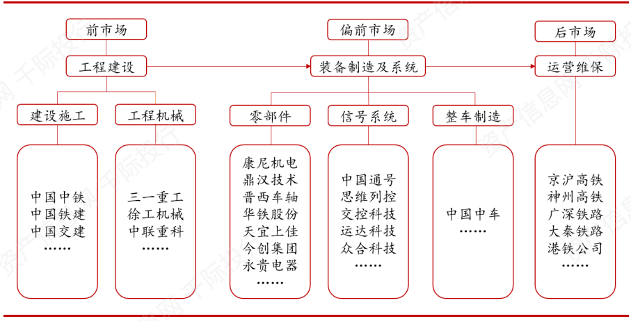 在基础设施建设阶段方面,其中路基桥涵工程环节,工程承包、工程机械、水泥、建筑材料等相关企业将直接受益;在轨道工程环节,轨道专用钢铁、机床、轨道辅助设备等也将受益;在配套设施和车辆采购环节,电气化设备、计算机控制系统、信号系统、车辆及配件厂商等相关企业将受益;在营运维护环节,铁路运营、耗材零部件、易损设备等企业将持续受益。