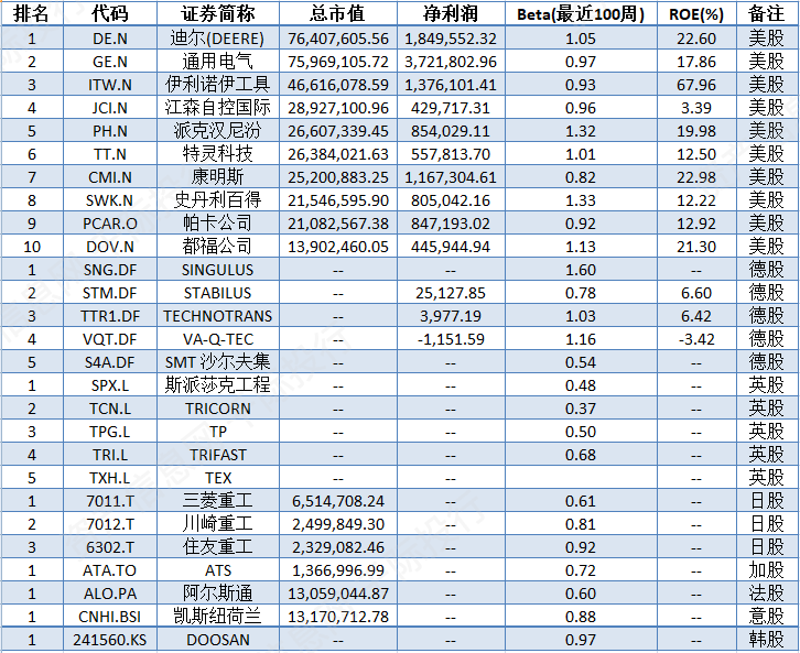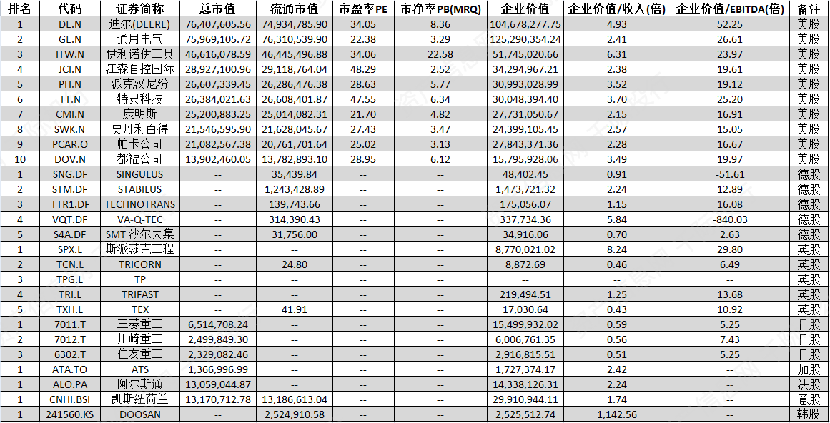全球非中国主要企业有迪尔(DEERE)[DE.N]、通用电气[GE.N]、伊利诺伊工具[ITW.N]、特灵科技[TT.N]、康明斯(CUMMINS)[CMI.N]、史丹利百得[SWK.N]、帕卡公司(PACCAR)[PCAR.O]、都福公司(DOVER)[DOV.N]、SINGULUS TECHNOLOGIES[SNG.DF]、STABILUS[STM.DF]、TECHNOTRANS[TTR1.DF]、VA-Q-TEC[VQT.DF]、SMT 沙尔夫集团[S4A.DF]、斯派莎克工程[SPX.L]、TRICORN[TCN.L]、TP[TPG.L]、TRIFAST[TRI.L]、TEX[TXH.L]、三菱重工[7011.T]、川崎重工[7012.T]、住友重工[6302.T]、ATS AUTOMATION TOOLING SYS[ATA.TO]、阿尔斯通[ALO.PA]、凯斯纽荷兰[CNHI.BSI]、DOOSAN BOBCAT[241560.KS]等。