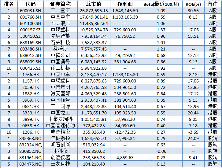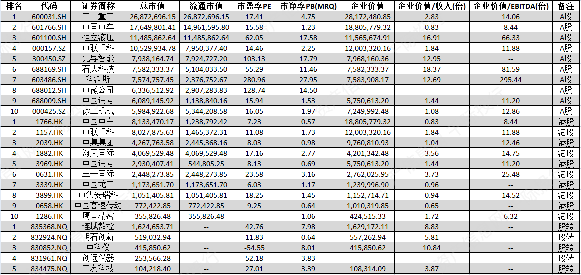 中国主要企业有三一重工[600031.SH]、中国中车[601766.SH]、恒立液压[601100.SH]、中联重科[000157.SZ]、先导智能[300450.SZ]、石头科技[688169.SH]、科沃斯[603486.SH]、中微公司[688012.SH]、中国通号[688009.SH]、徐工机械[000425.SZ]、中国中车[1766.HK]、中联重科[1157.HK]、中集集团[2039.HK]、海天国际[1882.HK]、中国通号[3969.HK]、三一国际[0631.HK]、中国龙工[3339.HK]、中集安瑞科[3899.HK]、中国高速传动[0658.HK]、鹰普精密[1286.HK]、中科仪[830852.NQ]、创远仪器[831961.NQ]、三友科技[834475.NQ]等。