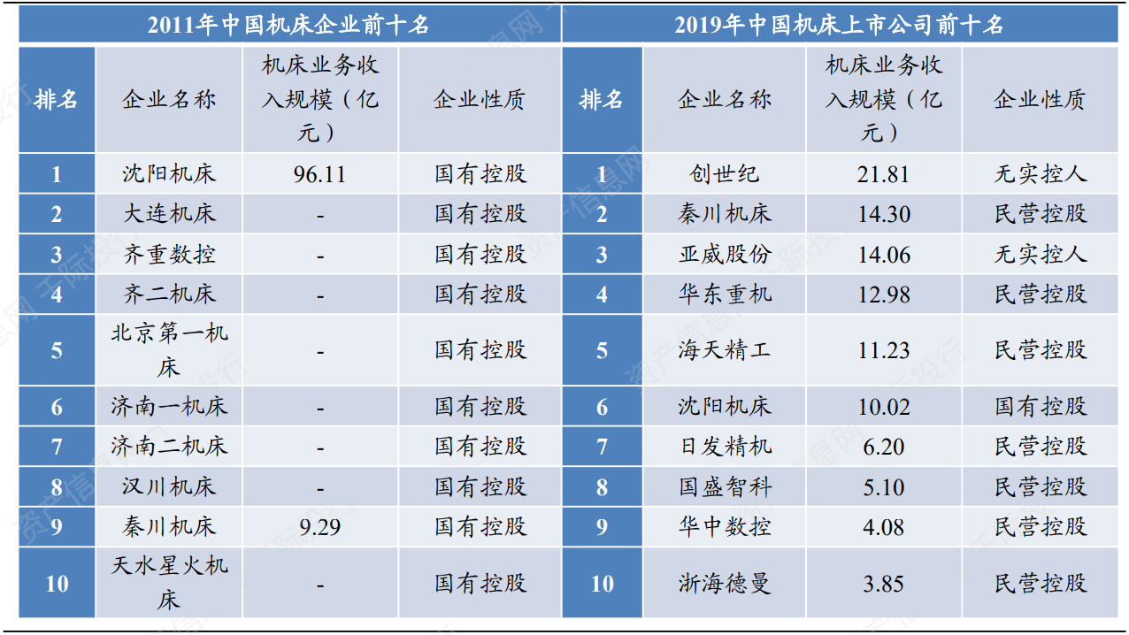 图 中国2011年机床行业前十名企业、2019年机床行业上市公司前十名对比