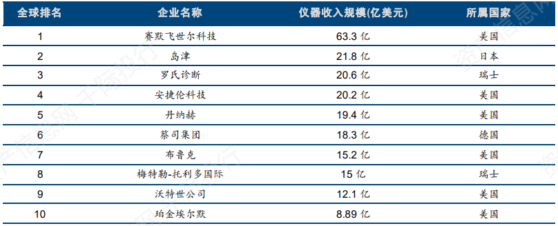 根据美国化学会(ACS)旗下的《C&EN》(Chemical & Engineering News)发布的全球仪器公司榜单, 在前 20 家公司中,有 8 家是美国公司,7 家来自欧洲,5 家公司位于日本。中国企业没有入选。
