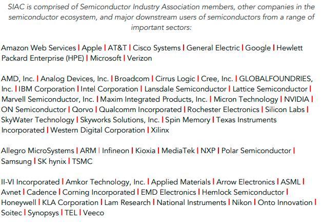 美国半导体联盟包含了美国半导体行业协会(SIA)的主要成员,同时还包括了亚马逊云服务,苹果,AT&T,思科系统,通用电气,谷歌,惠普企业,微软和威瑞森通讯等科技公司,总计64家公司。