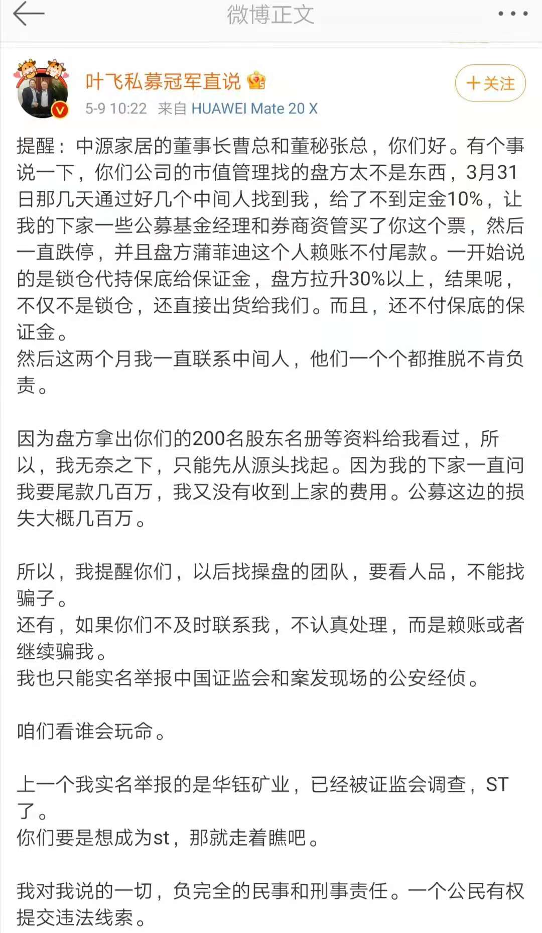 近期,一位私募大佬叶飞在微博上发布猛料,把A股上市公司中源家居(603709)推进了舆论风波。
