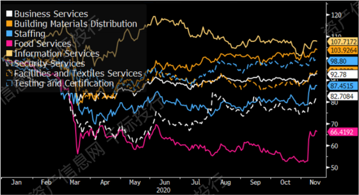 2020年,在疫情期间表现出盈利的子行业,或之后复苏强劲的子行业,表现优于更广泛的商业服务同行。其中信息服务表现最为强劲。然而,这些成功并不足以阻止截至11月17日的MSCI国际全球指数表现落后7.2%。信息服务、测试和设施以及纺织服务的表现优于同行,而建筑材料分销公司的收入在限制解除后大幅反弹,导致股价健康上涨。食品服务和人力资源服务是今年迄今表现最差的行业之一,前者反映了疫情带来的重大挫折。在最近有关COVID-19疫苗数据的利好消息发布后,这两个细分行业均出现强劲反弹。
