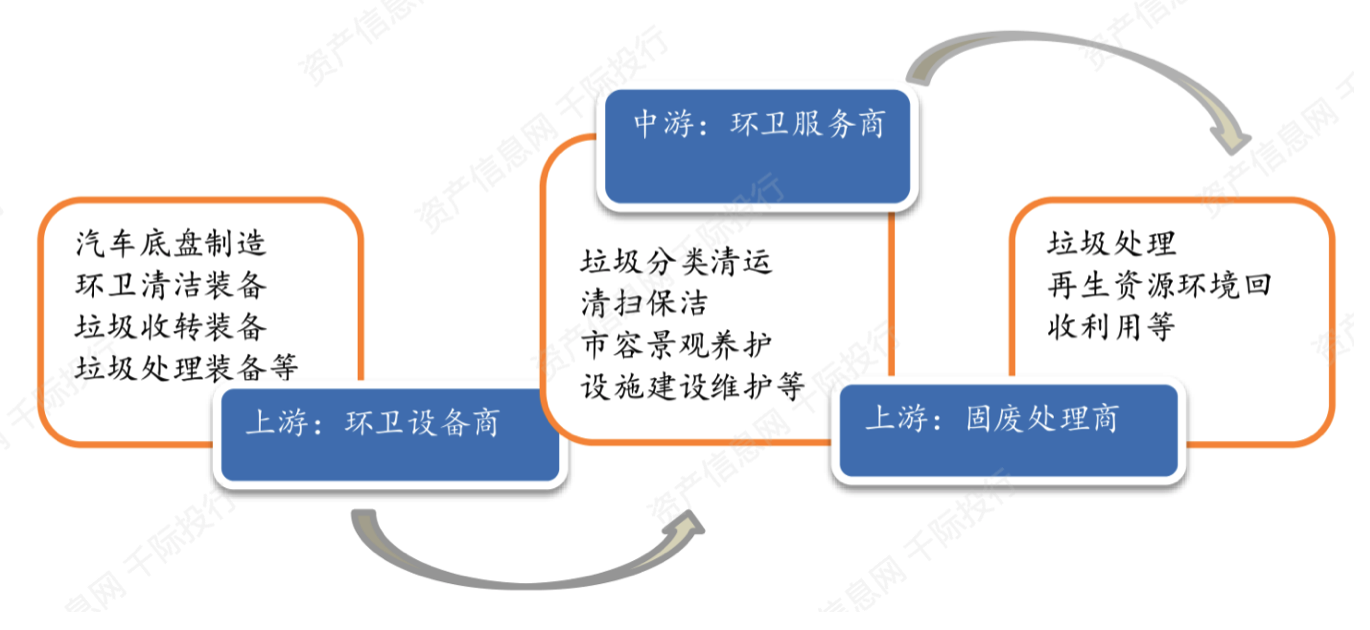 环卫行业产业链的上游主要为生产环卫清洁装备、垃圾处理装备等的环卫装备商,中游即为环卫服务商,负责垃圾分类清运、清扫保洁等,下游为固废处理商,进行垃圾处理,再生资源环境回收利用等。