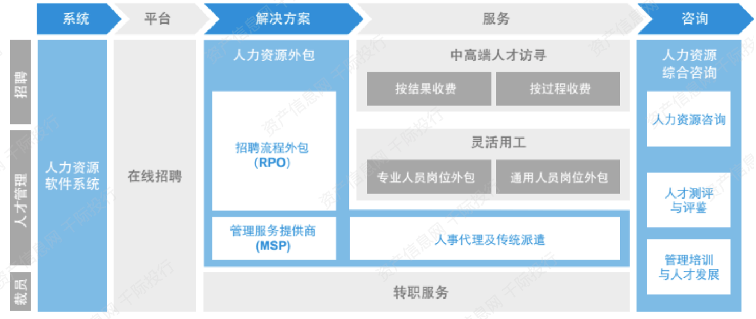 人力资源服务产业链是以人力资源服务的相关产品或服务、资本、知识和技术为纽带,以客户需求和市场资源为导向,以追求人力资源服务产品的附加值增值为目标,形成的网络关联的链式组织,产业链上的企业提供与人力资源管理和服务相关的有形或无形的服务。目前中国人服产业链已经涵盖中高端人才寻访、灵活用工、人力资源外包、在线招聘、人力资源咨询、人力资源信息系统等多个细分市场,相对较为完整。